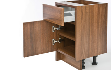 歐式櫃體一般都是使用低甲醛防潮(E1 V313)塑合板來建構。其組合方式,一種為使用櫃體組合(KD)五金結合,利用一公一母的五金結合方式,將板材與板材緊密的連結,組裝容易,搬運方便,可快速大量生產,缺點是可能不夠牢實,如IKEA家具即為此類。另一種為使用螺絲、鐵釘組合,是較傳統的作法。最後一種工法,則不用螺絲而使用木栓加上膠結合,並置於固定結合機上30分鐘施壓固定成型,穩定耐用且美觀,此法較費工費時,所以價格也可能相對較高,本公司即採用此正規歐洲工法製作,品質有保證。