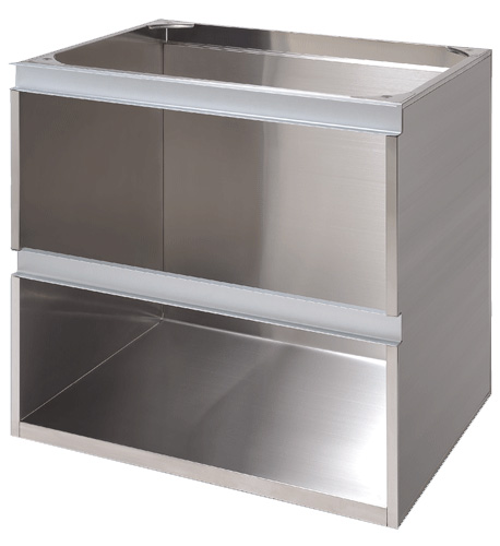 不銹鋼櫃體以304不銹鋼製作,一般使用厚度約0.4-0.6mm 不銹鋼板製作。單層不銹鋼櫃體,以大型沖床壓製成型後再以點焊接合, 單層桶身簡易的辨識方法就是由內檢視左右兩側若可見到直立的支撐骨料就是屬於單層桶身。雙層不銹鋼櫃體,由兩片鋼板內夾木心板製作而成,看起來較一體完整,但價格相對也較高。不銹鋼若沒好好清潔保養,在很多情況下,還是會產生銹斑的。